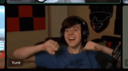 Softwilly and Isaacwhy's excited reaction, cheering with headphones on in a room with a checkered wall.