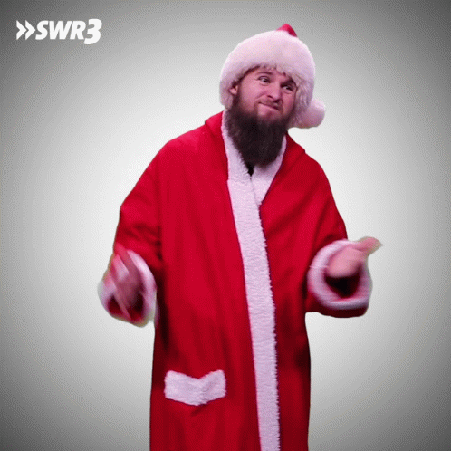 Dominik, dressed as Santa Claus, shrugging and dancing to Sola Solala for SWR3 holidays.