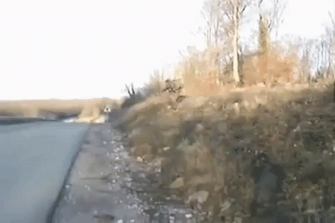 Two soldiers, likely recruits, stumble and fall onto a road in a funny, unexpected moment.