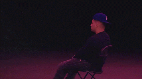 Man in NY cap, black shirt, and dark pants sits alone in a dark, purple-lit room, looking disappointed.