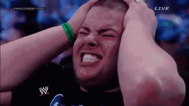 A man reacts with intense frustration, holding his head in his hands during what appears to be a wrestling match.