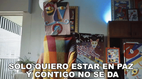 Bejo's artistic figure with a box head and colorful clothing, displaying the caption 'Solo Quiero Estar En Paz Y Contigo No Se Da'.