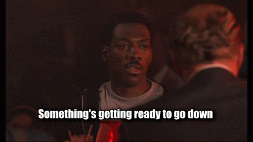 Eddie Murphy looks intently in a dimly lit bar as the caption 'Something's getting ready to go down' appears.