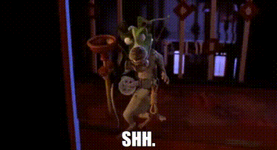 Otis from Son of the Mask makes a 'shh' gesture while holding a trumpet, appearing sneaky.