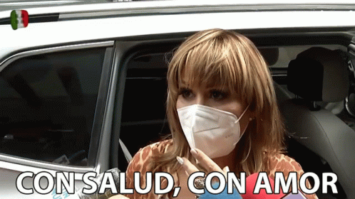 Alejandra Guzman in a car, wearing a face mask, with the phrase 'Con Salud, Con Amor' displayed on screen.