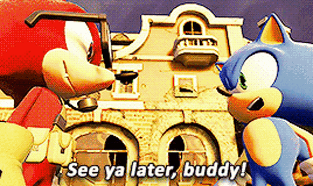 Sonic and Knuckles share a fist bump and say 'See ya later, buddy!' in a video game scene.