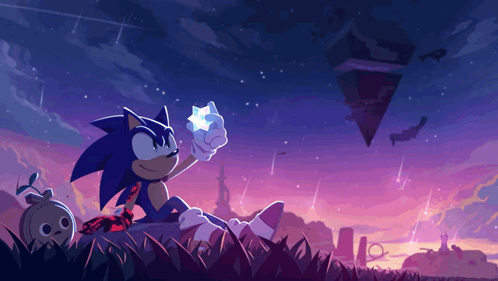 Sonic the Hedgehog sits in the grass, holding a glowing star under a starry, purple sky with shooting stars.