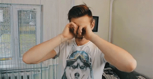 Mr Dim4ik yawns widely, stretching his arms while wearing a white t-shirt with a husky graphic.
