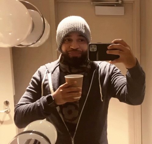 Henry Santos smiles and raises his eyebrows while holding a coffee cup, capturing a happy moment.