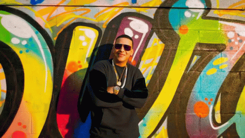 Daddy Yankee smiling confidently in front of a vibrant, colorful graffiti wall.