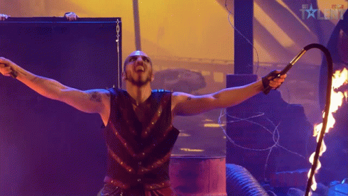A performer on Got Talent España wields a flaming whip with a confident smile during his act.