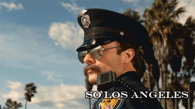 A police officer and women on roller skates enjoying the Los Angeles beach scene, featuring a classic Sony Walkman.