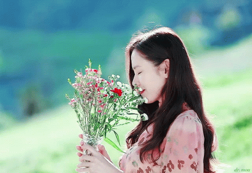 Sonyejin from CLOY happily smells a bouquet of flowers while smiling in a beautiful outdoor setting.
