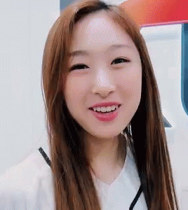 Soobin from WJSN smiling brightly at the camera, showcasing her long brown hair and pink lipstick.