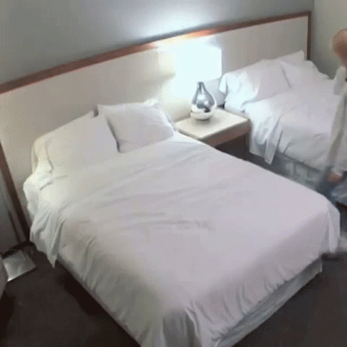 Beomgyu from TXT, during Soobtime, dramatically falls face-first onto a hotel bed in a funny reaction.