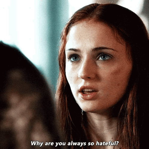 Sophie Turner as Sansa Stark asks 'Why are you always so hateful?' with an angry expression.