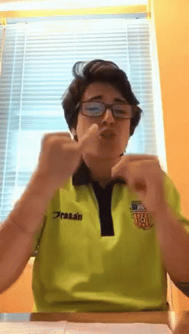 A man wearing glasses and a green shirt uses sign language to communicate.