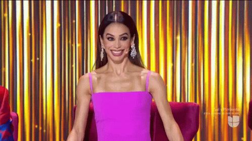 Biby Gaytan's shocked reaction on Pequenos Gigantes, wearing a vibrant pink dress against a golden backdrop.