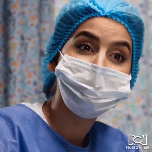 Maria Clara Gonzalez, played by Diana Hoyos, looks surprised while wearing a surgical mask and blue cap.