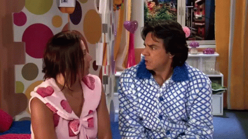 Ludovico Peluche looks shocked with his mouth open, while Federica Peluche is beside him in a scene from La Familia P. Luche.