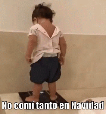 A child reacts with surprise and dismay while weighing herself on a scale, lamenting Christmas eating.