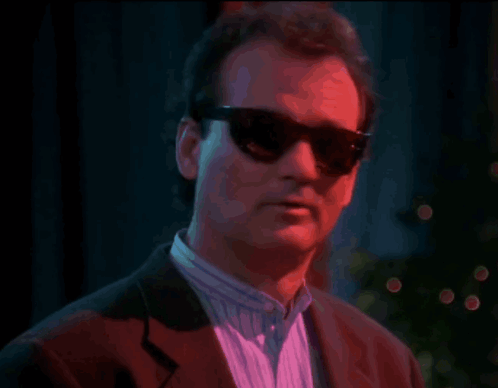Bill Murray as Phil Connors in 'Groundhog Day' looks surprised and serious, wearing sunglasses and a suit.