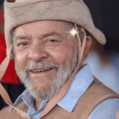 Lula smiles brightly, wearing a traditional hat and vest, with a sparkling effect on his face.