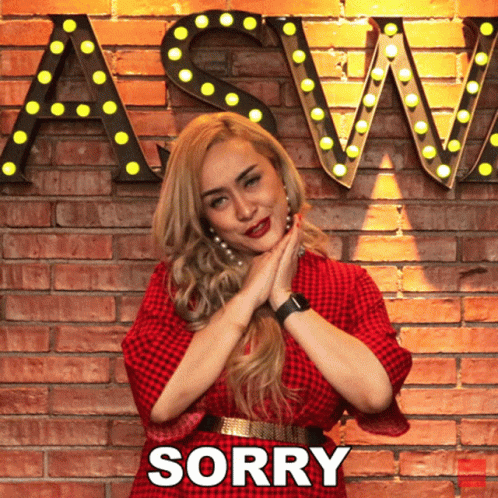 Lia3Srigala expresses apology in front of a brick wall with a 'SORRY' sign, hands clasped.