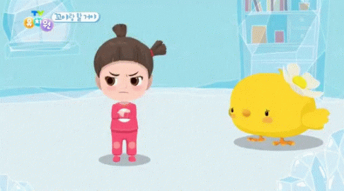 An animated girl from Tv Kindergarten looks angry, then a chick apologizes with 'Sorry' in Korean.