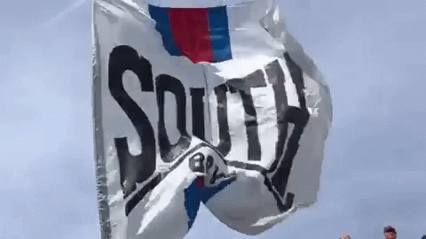 A large white flag with 'SOUTH BOYS' and red/blue stripes, representing Sud Steaua ultras, waves in the wind.