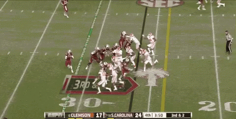 A South Carolina Gamecocks player breaks free for a significant run against Clemson in a crucial 3rd down play.