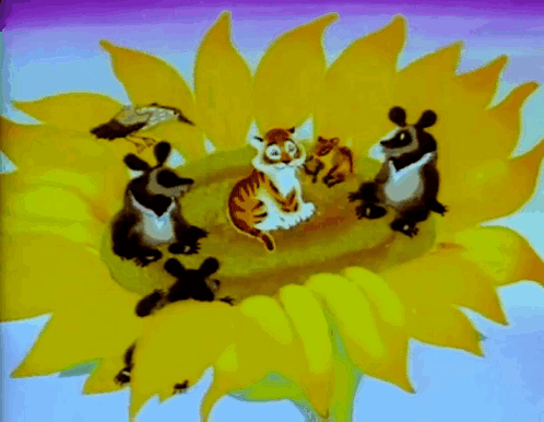 Animated scene from Soviet Cartoons featuring a tiger cub and other animals on a vibrant sunflower.