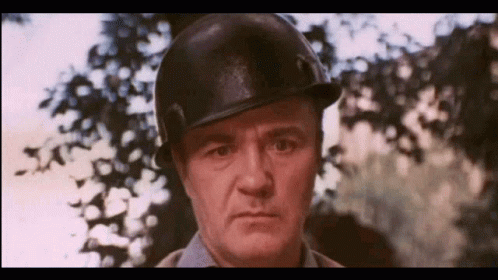 Actor Kuravlev in a Soviet comedy, wiping sweat from his brow while wearing a helmet, looking nervous.