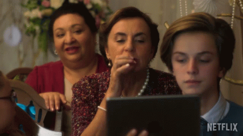 Characters from La Casa De La Flores react to a tablet, with one saying 'Soy Muy Discreta No Digo Nada'.