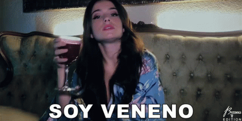 Shainny, with 'Soy Veneno' text, holds a red drink while sitting on a couch.