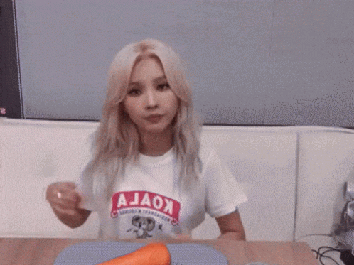 Soyeon from (G)I-DLE smiles and makes cute gestures while sitting at a table with a carrot.