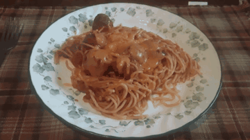A close-up shot of a plate of classic spaghetti and meatballs, topped with sauce and possibly cheese.