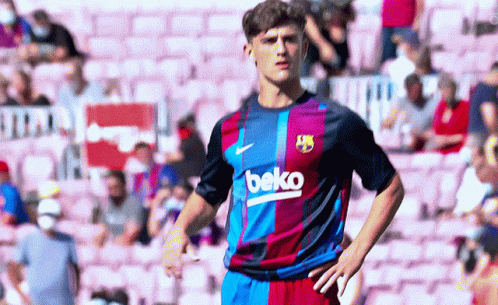 Young soccer star Gavi playing for Barcelona FC in a stadium, showcasing his skills.