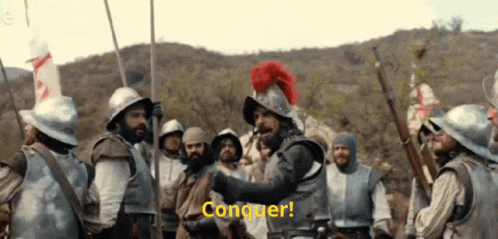 Spanish conquistador Valdivia rallies his soldiers, shouting 'Conquer!' in a historical scene, likely depicting the conquest of Chile.
