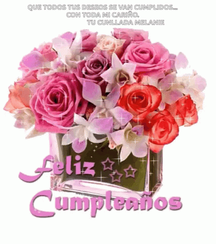A sparkling bouquet of flowers in a vase, featuring the celebratory message 'Feliz Cumpleanos'.