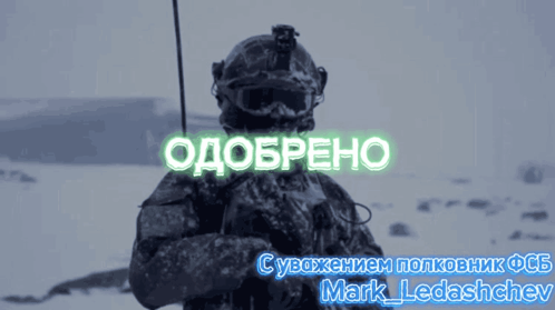 A soldier in winter camouflage stands in the snow with a neon sign reading 'APPROVED' by FSB Colonel Mark_Ledashchev.