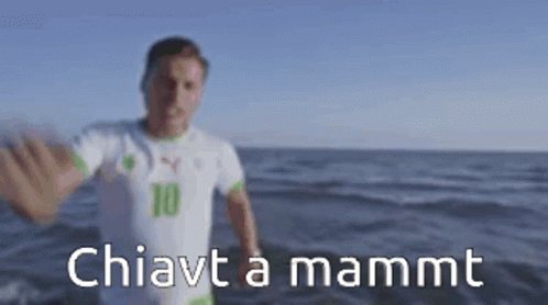 Speranza gestures in the sea with 'Chiavt a mammt' text overlay, wearing a white number 10 shirt.