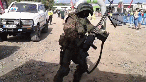 A soldier in Spetsnaz-style gear performs a dance with a machine gun at an outdoor event.