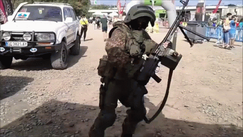A person in Spetsnaz-like military gear holding and lifting a heavy machine gun at an outdoor event.