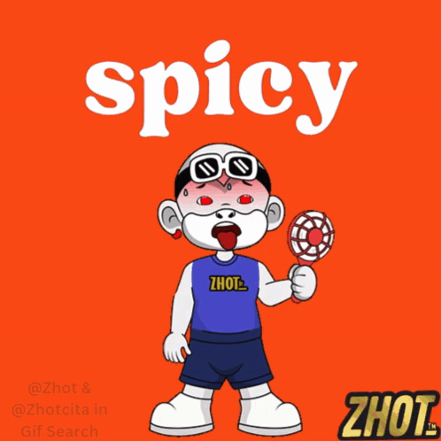 An animated character reacts to something spicy, fanning itself and sticking its tongue out.