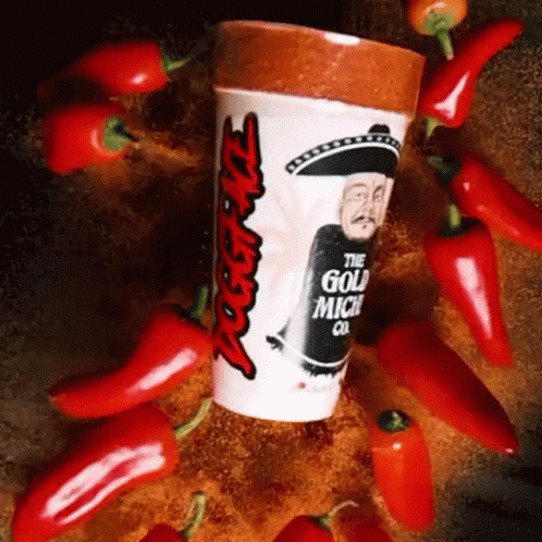A cup featuring Doggface208, surrounded by vibrant red chili peppers and chili powder, emphasizing a spicy theme.
