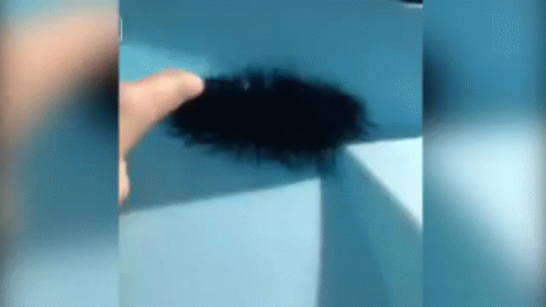A hand touches a large cluster of black spiders, causing them to scatter across a blue surface.