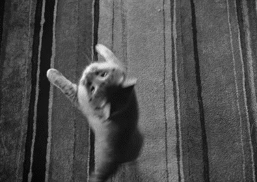 A cute cat playfully spins and tumbles on a striped rug in a black and white video.