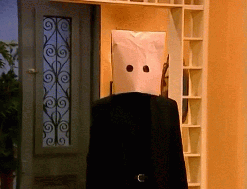 A person identified as German, wearing a paper bag over their head, stands in a room.