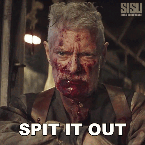 Yeagor Dragunov from the movie Sisu, covered in blood, intensely demands someone to 'Spit it out'.